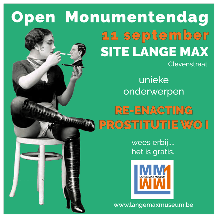 Een pittig en rijkelijk geïllustreerd onderwerp zal ‘prostitutie tijdens WO 1” zijn. Dit onderwerp kan mits een kanttekening ook in relatie gebracht worden met de hoofdthema’s. Een re-enactment groep, We Will Remember Pops, zal deze historische gebeurtenissen op een ludieke wijze tot leven brengen. De mobiele kamer voor de daad, anno 14/18, zal er zijn, de dames ook. Er is daarbij een passende ‘ontkleed-wedstrijd’. Mannen zullen er een Schwanzkontrole ondergaan.